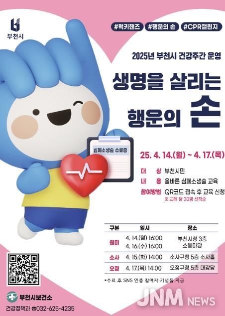 제이앤엠뉴스 | 부천시는 오는 4월 14일부터 20일까지를 ‘건강주간’으로 지정하고, ‘생명을 살리는 행운의 손’을 주제로 심폐소생술(CPR) 교육을 운영한다.