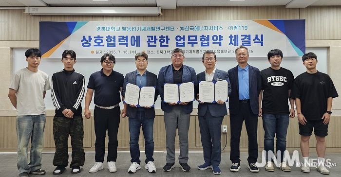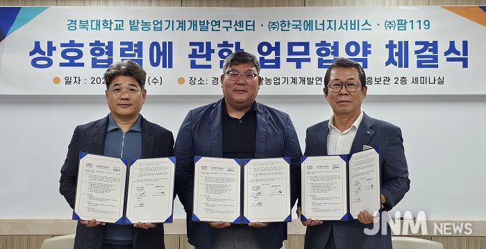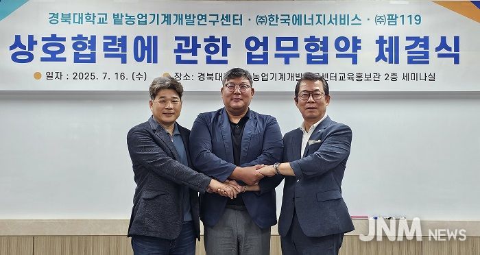 제이앤엠뉴스 | 경북대학교 밭농업기계개발연구센터에서 7월 16일(화) 오전 11시, 농업 분야의 지속가능성과 혁신을 이끌기 위한 산학연 업무협약(MOU) 체결식이 열렸다. 이날 협약은 경북대학교, ㈜한국에너지서비스, ㈜119팜 등 3개 기관이 참여한 가운데 진행됐으며, 각 기관은 영농형 태양광 시스템과 친환경 방제 기술, 농업 에너지 효율화 기술의 공동 개발 및 실증을 통해 탄소 중립형 농생명 시스템 구축에 협력하기로 합의했다.
