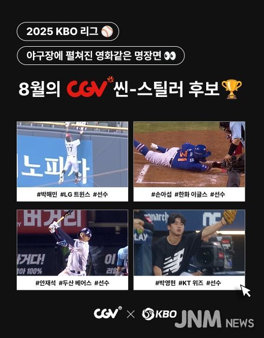 제이앤엠뉴스 | KBO와 CGV가 공동 제정한 ‘월간 CGV 씬-스틸러상’의 8월 수상자 후보로 LG 박해민, 한화 손아섭, 두산 안재석, KT 박영현 등 총 4명의 선수가 선정됐다.