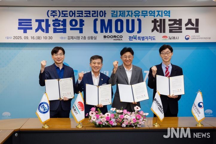 16일 시에 따르면 시청 2층 상황실에서 ㈜도어코코리아와 368억 원 규모의 투자협약(MOU)을 체결했으며 이번 협약으로 김제자유무역지역에 1만 평(33,000㎡) 규모의 제2공장을 신설해 350여 명의 신규 고용이 창출될 예정이다.