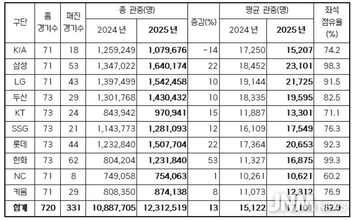 최종적으로 2025시즌은 지난 시즌 보다 약 13% 증가한 1,231만 2,519명의 관중이 입장하며 평균 관중 1만 7,101명을 기록했다. 전체 경기 수의 약 46%인 331경기가 매진됐고, 좌석 점유율 또한 82.9%를 기록했다.
