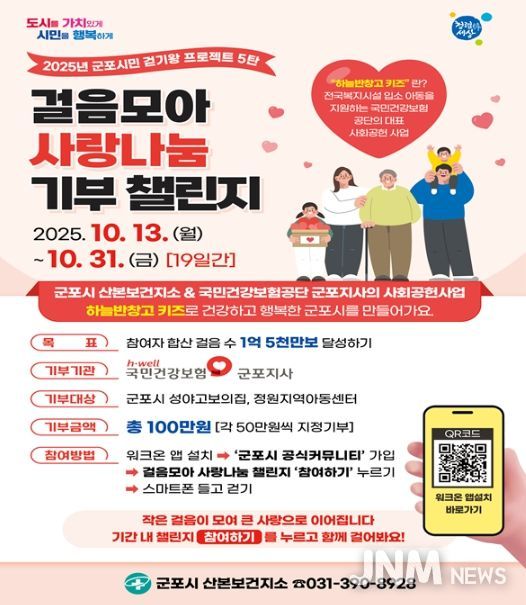 제이앤엠뉴스 | 군포시 산본보건지소는 오는 10월 13일부터 31일까지(19일간) 국민건강보험공단 군포지사와 함께하는 '걸음모아 사랑나눔' 기부챌린지를 운영한다.