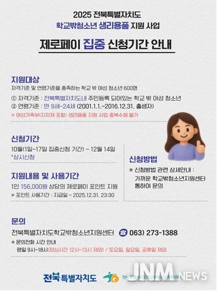 제이앤엠뉴스 | 전북특별자치도가 경제적 부담을 겪는 학교 밖 여성청소년들을 대상으로 생리용품을 지원하는‘2025년 학교 밖 여성청소년 건강지원사업’을 추진한다.
