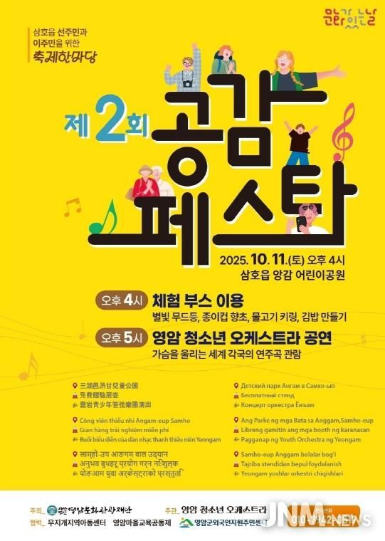 제이앤엠뉴스 | (재)영암문화관광재단과 영암청소년오케스트라는 문화가 있는날 행사지원 사업으로 2025년 10월 11일 오후 4시 삼호읍 앙감 어린이 공원에서 ‘제2회 공감페스타’행사를 개최한다.