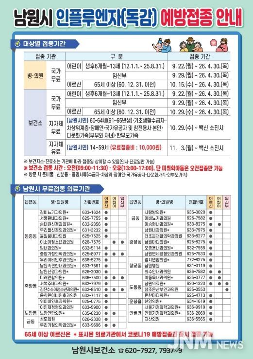 이에 남원시보건소는 겨울철 인플루엔자 유행과 지속되는 코로나19 감염 위험을 고려해 만 65세 이상 어르신(1960년 12월 31일 이전 출생자)을 대상으로 인플루엔자와 코로나19 백신의 동시 예방접종을 권장한다고 밝혔다.