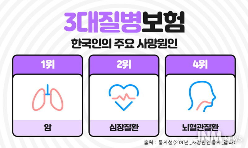 제이앤엠뉴스 | 한국인의 주요 사망원인중에 암, 뇌혈관질환, 심혈관질환은 흔히 3대질병이라 일컬어지며 살아가면서 가장 먼저 대비해야 하는 중대질병으로 항상 강조되고 있다. 이들 질병에 미리 대비하기 위해 가입하는 것이 진단비보험인데, 이러한 3대질병진단비를 중점으로 보장하는 보장성보험이 3대진단비보험 이다. 3대질병진단비보험은 각각의 질병에 주목해서 보장하기도 하지만, 나에게 맞는 추가 특약을 잘 골라서 가입한다면 종합건강보험으로도 충분히 활용도가 높다.