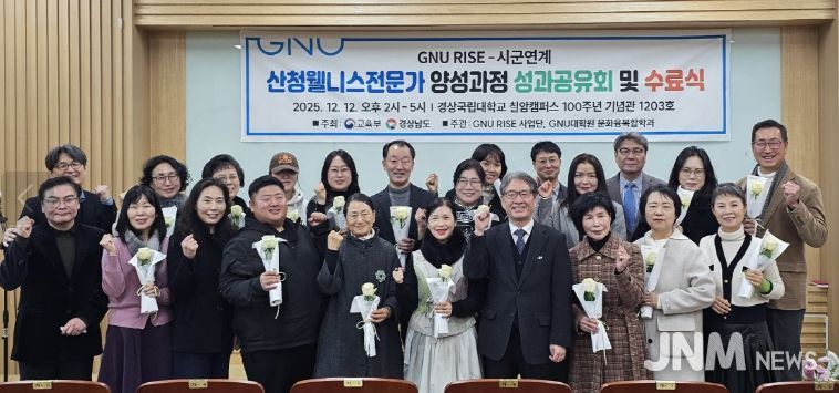 제이앤엠뉴스 | 경상국립대학교 라이즈(RISE)사업단 시군연계 사업 ‘산청군 웰니스전문가 양성과정’은 1기 성과공유 및 수료식을 12월 12일 오후 칠암캠퍼스 100주년 기념관 1203호에서 열었다.