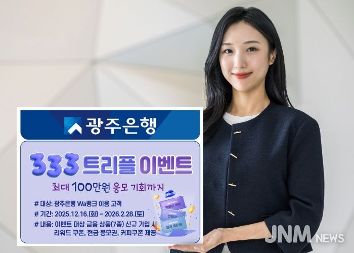 제이앤엠뉴스 | 광주은행은 2025년 12월 16일부터 2026년 2월 28일까지 광주은행 Wa뱅크 이용 고객을 대상으로 ‘333 트리플 이벤트’를 진행한다고 밝혔다.