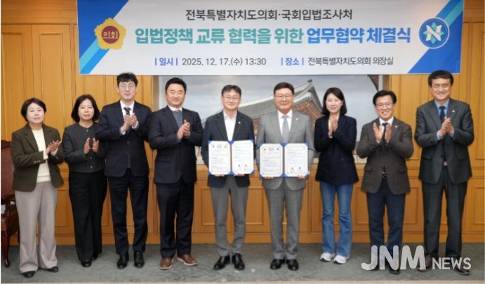 제이앤엠뉴스 | 전북특별자치도의회는 17일 국회입법조사처와 입법정책 분야의 상호 교류 및 협력을 위한 업무협약(MOU)을 체결했다.