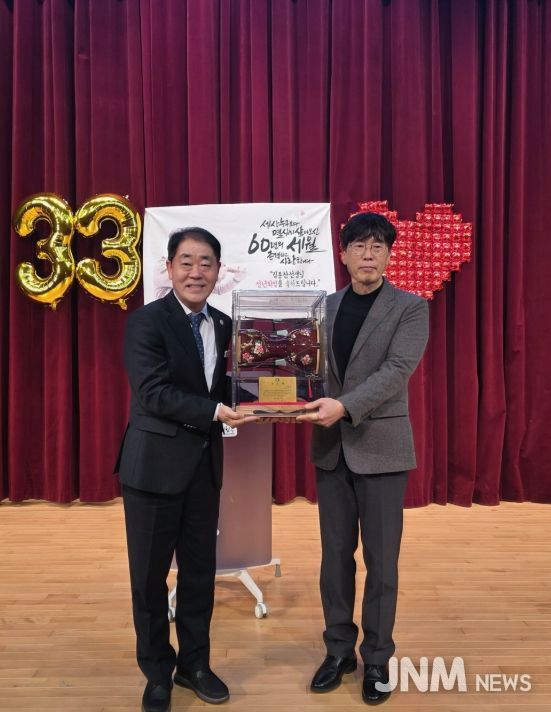제이앤엠뉴스 | 충북 영동군은 지난 17일 국악체험촌 우리소리관 공연장에서 ‘2025년 하반기 난계국악단 퇴임식’을 개최하고, 33년간 난계국악단에서 활동해 온 대금 연주자 김종찬 단원의 퇴임을 기념하는 뜻깊은 시간을 가졌다고 밝혔다.