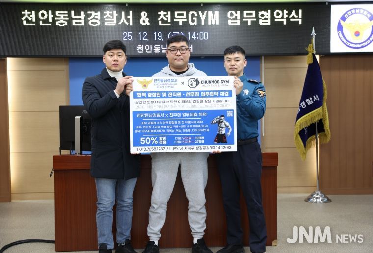 제이앤엠뉴스 | 천안 동남경찰서(서장 송해영)는 2025년 12월 19일(금) 오후 2시, 천안동남경찰서 중회의실에서 무에타이·MMA 전문 체육관인 ‘천무짐’(관장 문보람)과 ‘경찰관 체력 증진 및 복지 향상’을 위한 업무협약(MOU)을 체결했다고 밝혔다.