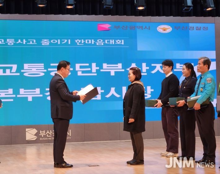 제이앤엠뉴스 | 지난 12월 2일 부산광역시청 대강당에서 개최된 한국도로교통공단 부산지부 주최 '2025년 교통사고 줄이기 한마음 대회'에서 부산남구시니어클럽 소속 윤지혜 참여자가 교통안전 향상에 기여한 공로를 인정받아 감사장을 받았다.