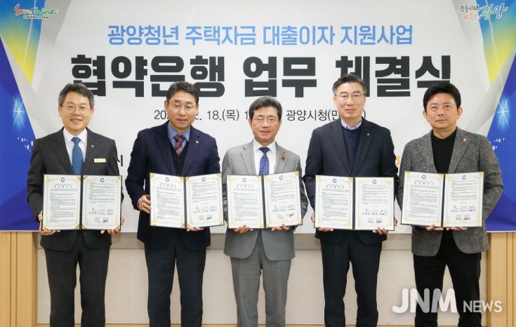 제이앤엠뉴스 | 광양시는 2026년도 청년주택자금 대출이자 지원사업 추진에 앞서 보다 효율적인 사업 운영을 위한 협력 체계를 구축하고자, 지난 19일 시청 만남실에서 관내 4개 금융기관(신한은행, NH농협은행, 광양농협, 동광양농협)과 청년 주택자금 대출이자 지원사업업무협약을 체결했다.