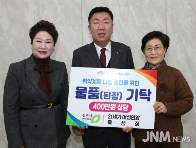 임시청사 직지실에서 진행된 기탁식에는 이범석 청주시장과 유현순 21세기여성연합 청주시지부 회장, 전순자 옥샘정 대표가 참석했다.