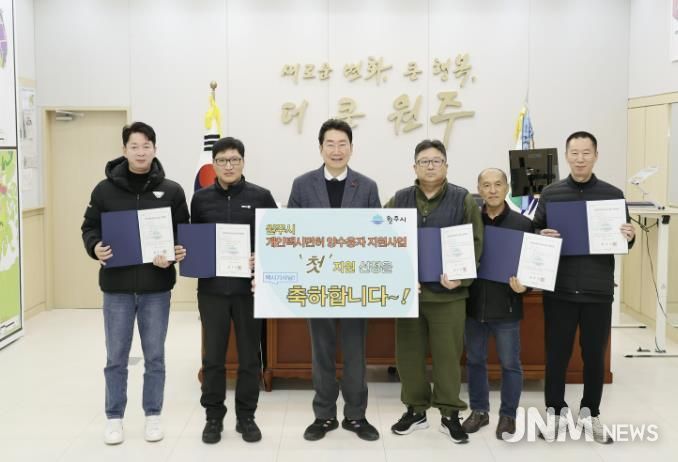 제이앤엠뉴스 | 원주시는 올해 신규사업으로 추진한 개인택시 면허 양수 융자지원 사업 첫 지원자 5명을 선정하고, 22일 원주시장 집무실에서 축하 인사를 전했다.