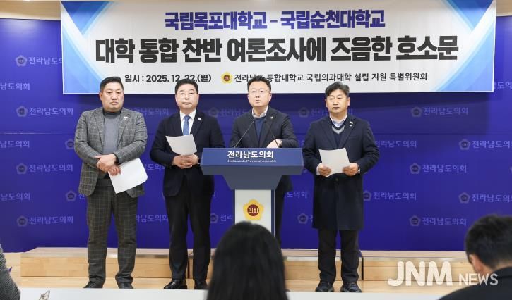 제이앤엠뉴스 | 전라남도의회 통합대학교 국립의과대학 설립 지원 특별위원회는 교육부 통폐합 심사위원회 결정을 앞두고 오늘부터(22~23일) 진행 중인 국립목포대학교–국립순천대학교 통합 찬반 투표와 관련해, 양 대학 구성원의 적극적인 관심과 참여를 촉구하는 호소문을 12월 22일 발표했다.