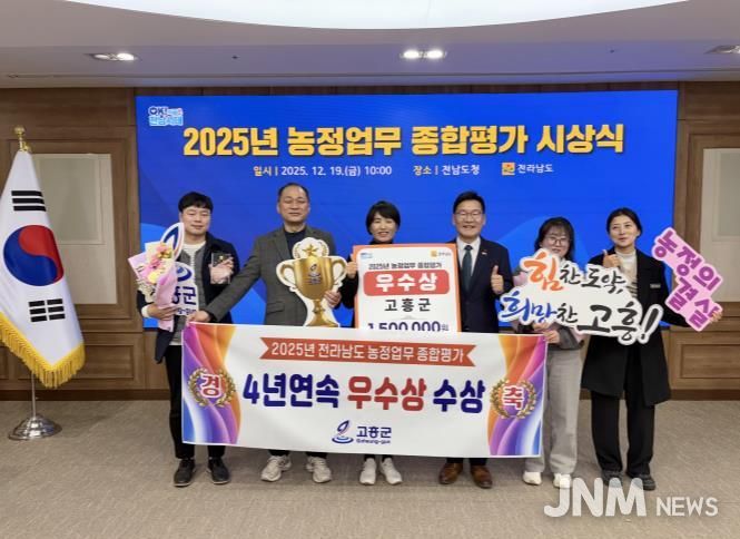 제이앤엠뉴스 | 고흥군이 전라남도가 주관한 ‘2025년 농정업무 종합평가’에서 4년 연속 ‘우수상’을 수상하며, 농업 강군(强郡)으로서의 위상을 다시 한번 입증했다.