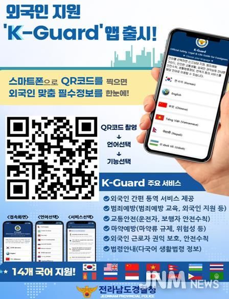 제이앤엠뉴스 | 전남경찰청은 국내 체류 외국인의 범죄·사고 예방과 인권이 존중받는 사회를 위해 외국인 맞춤형 통합 정보제공 앱『K-Guard』를 개발하고, 12월 22일부터 시범운영에 들어간다고 밝혔다.