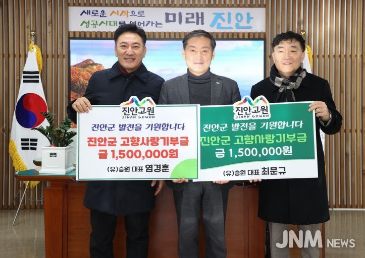 전춘성 진안군수는 “꾸준히 진안을 위해 따뜻한 마음을 전해주시는 염경훈·최문규 대표님께 깊은 감사의 뜻을 전한다”며, “기탁해주신 소중한 기부금은 진안군민의 복리 증진과 지역 발전을 위해 소중히 사용하겠다”고 전했다.