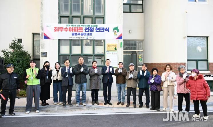 제이앤엠뉴스 | 울산 북구는 22일 2025년 저탄소 실천 우수아파트 경진대회에서 최우수아파트로 선정된 명촌주공아파트에서 현판식을 열었다.