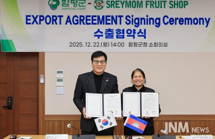 22일 함평군은, 캄보디아 현지 유통업체 SREYMOM FRUIT SHOP(이하 슬레이맘)과 이날 함평군청에서 샤인머스캣·딸기·태추단감 등 30만 불 규모의 농특산물 수출 확대 협약을 체결했다.