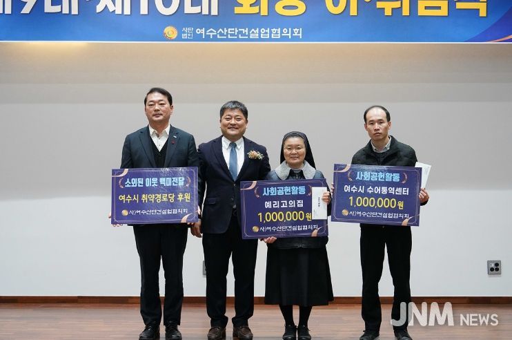 제이앤엠뉴스 | 여수시는 (사)여수산단건설업협의회(회장 정성호)가 지난 22일 제9·10대 회장 이취임식에서 관내 취약 복지시설을 위해 후원금과 백미 등 약 1천 7백여만 원 상당의 후원금품을 전달하며 지역사회에 나눔을 실천했다고 밝혔다.