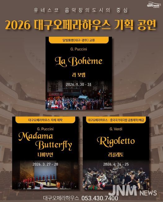 2026년 상반기에 대구오페라하우스는 푸치니 오페라 '라 보엠', '나비부인' 그리고 베르디 오페라 '리골레토'로 관객들을 만난다. 이어서 하반기에 있을 ‘제23회 대구국제오페라축제’는 야외 오페라를 시작으로, 지역 내 공연장들과 협력하여 폭 넓고, 다양한 무대에서 공연을 선보일 예정이다.