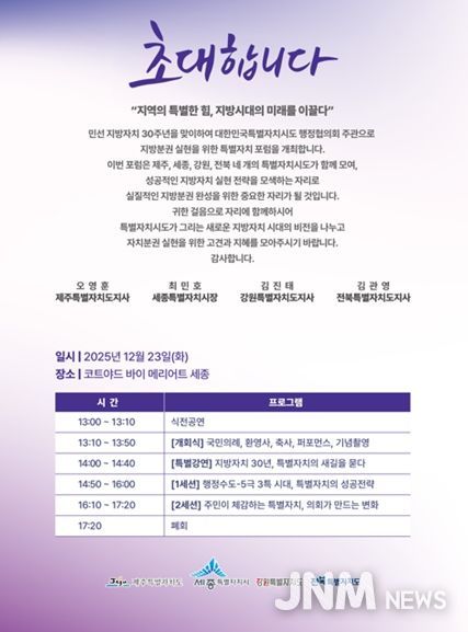 제이앤엠뉴스 | 강원특별자치도는 12월 23일 코트야드 바이 메리어트 세종에서 강원, 제주, 세종, 전북 4개 특별자치시도지사들이 모여 대한민국특별자치시도 행정협의회 두 번째 정기회의를 개최했다.