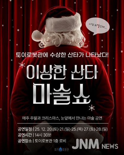 크리스마스 당일에는 ‘이상한 산타 마술쇼’가 펼쳐진다. 겨울 분위기에 어울리는 유쾌한 연출과 관객 참여형 구성으로 아이부터 어른까지 함께 즐길 수 있는 공연으로, 28일 주말까지 이어서 진행된다. 이와 함께 ▲산타와 함께 사진을 남길 수 있는 ‘이상한 산타와 한 컷’ ▲이상한 산타의 ‘선물 보따리’ 이벤트가 운영되며, 선물은 선착순 500명에게 제공되어 크리스마스 방문의 즐거움을 더할 예정이다.
