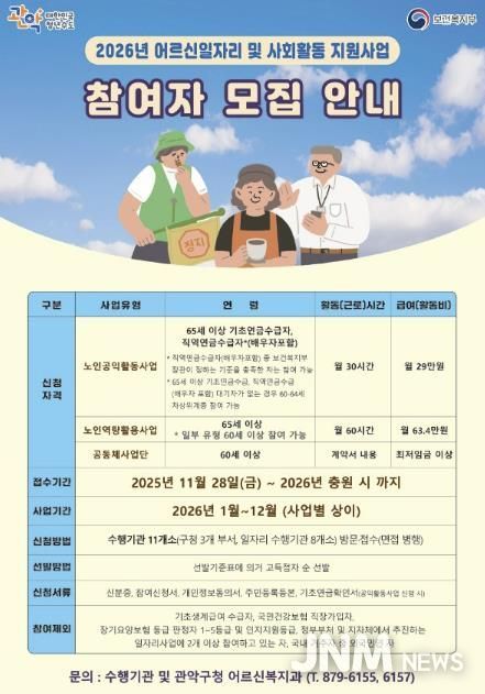 제이앤엠뉴스 | 관악구가 초고령시대 진입을 앞두고 어르신들의 사회참여 증진과 노후 소득 보장을 위해 ‘2026년 노인일자리 및 사회활동 지원사업’을 대폭 확대 추진한다.