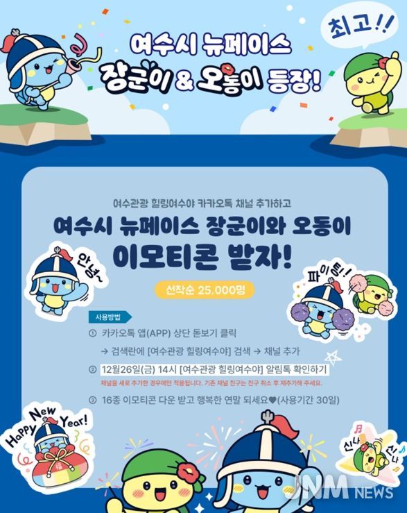 제이앤엠뉴스 | 여수시가 새롭게 리뉴얼된 마스코트 ‘장군이·오동이’ 카카오톡 이모티콘을 오는 26일 오후 2시부터 선착순 2만 5천 명에게 무료로 배포한다고 밝혔다.