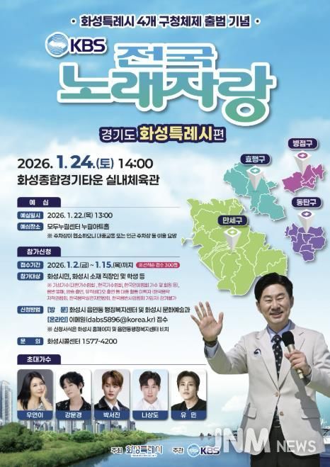 제이앤엠뉴스 | 화성특례시는 다음 달 2일부터 15일까지 ‘KBS 전국노래자랑’ 화성특례시편 참가자를 모집한다고 24일 밝혔다.