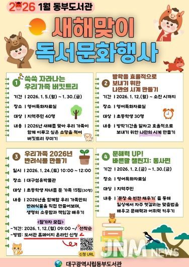 제이앤엠뉴스 | 대구동부도서관은 다가오는 새해를 맞아 지역주민이 도서관에서 뜻깊은 한 해를 시작할 수 있도록 1월 한 달간 동부도서관 ‘새해맞이 특별 독서문화행사’를 운영한다.