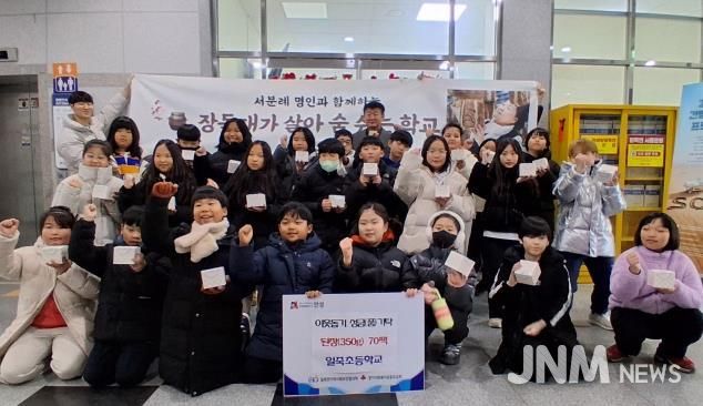 제이앤엠뉴스 | 일죽면행정복지센터는 일죽초등학교 3~4학년 학생들이 서일농원과 함께 진행한 전통된장 만들기 프로그램에서 직접 만든 된장(1팩 350g) 70개를 일죽면 지역사회에 기부하며 따뜻한 나눔을 실천했다고 밝혔다.