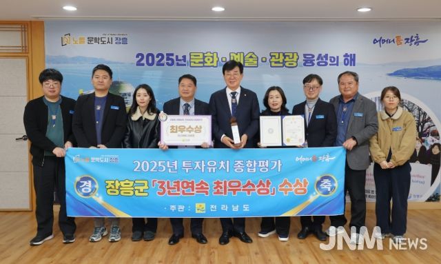 이번 평가는 전남도 22개 시·군을 대상으로 투자유치 실적, 유치 여건 조성, 일반 행정 등의 실적을 평가해 선정했으며 장흥군은 ‘2023년, 2024년 최우수상’에 이어 3년 연속 수상의 영예를 안았다.