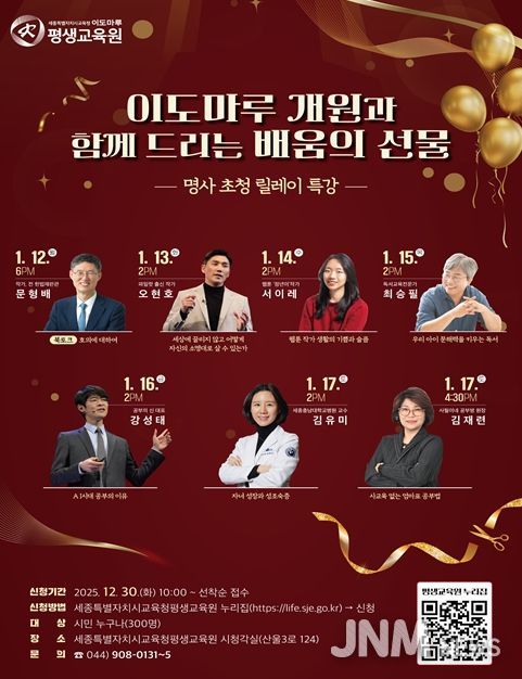 제이앤엠뉴스 | 세종특별자치시교육청평생교육원(원장 송정순)은 2026년 1월 개원을 기념해 1월 12일부터 17일까지 6일간 개원 주간을 운영하고, 개원 행사의 일환으로 ‘명사 초청 릴레이 특강’을 매일 개최한다.