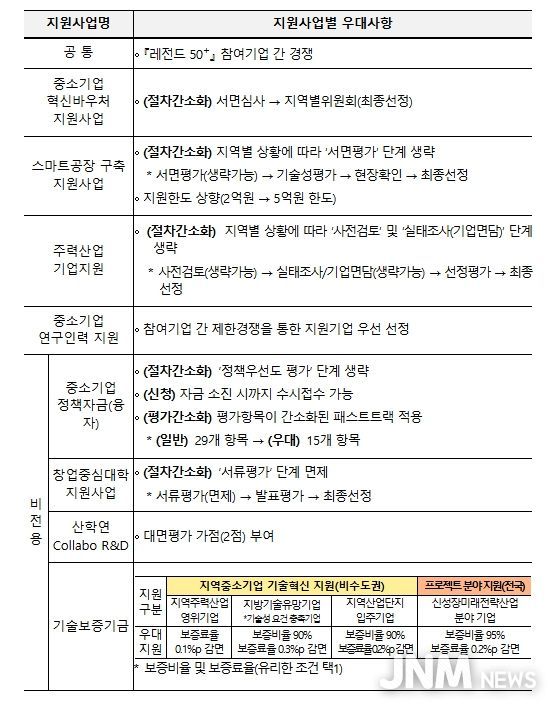 또한 정책자금, 창업·성장, R&D, 보증 분야에는 선정 절차 간소화, 평가 면제 또는 가점 부여, 지원한도 상향, 보증조건 우대 등 현장의 의견을 반영한 다양한 제도개선 사항이 적용된다.