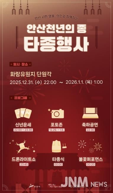 제이앤엠뉴스 | 안산시는 오는 31일 오후 10시부터 화랑유원지 단원각에서 ‘2026 안산 천년의 종 타종 행사’를 개최한다고 30일 밝혔다.