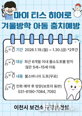 참여를 희망하는 보호자는 이천시 보건소 구강보건실로 전화 예약 후 사업 기간 내(2026. 1. 19. ~ 1. 30.) 아동과 함께 방문하면 된다.