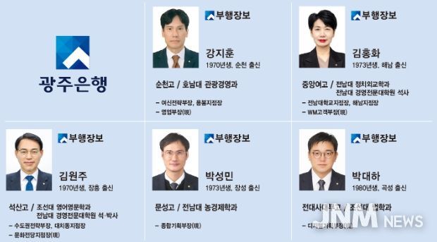 제이앤엠뉴스 | 광주은행은 30일, 본부 조직개편과 함께 부행장보 5명(강지훈, 김홍화, 김원주, 박성민, 박대하)을 신규 선임하는 임원 인사를 단행했다고 밝혔다.