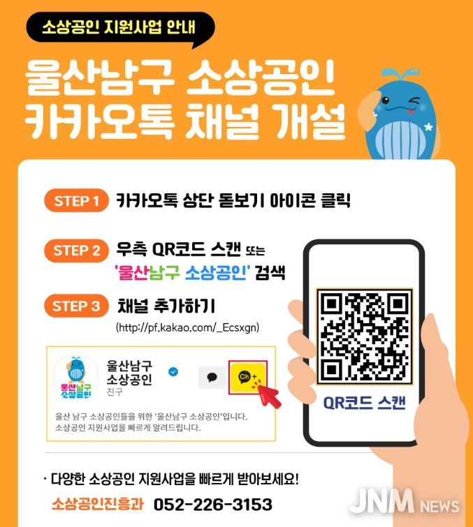 제이앤엠뉴스 | 울산 남구는 다양한 소상공인 지원 정보를 보다 신속하고 편리하게 제공하기 위한 ‘울산남구 소상공인’카카오톡 채널을 개설해 운영한다고 5일 밝혔다.
