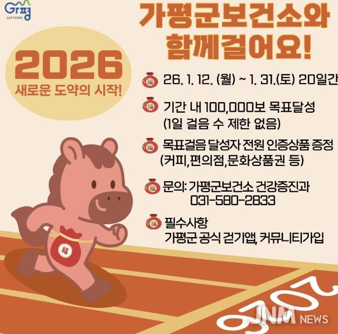 제이앤엠뉴스 | 가평군보건소가 ‘2026년 보건소와 함께 걸어요!’를 주제로 건강 걷기 프로그램을 운영하며 새해 걷기운동 실천을 독려한다.