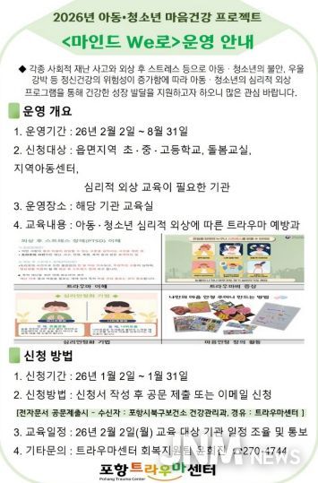 한편, 포항시 트라우마센터는 시민을 위한 심리상담, 전문 치유 장비 체험 등 다양한 회복 프로그램을 상시 운영하고 있다. 자세한 내용은 센터로 문의 또는 홈페이지에서 확인할 수 있다.
