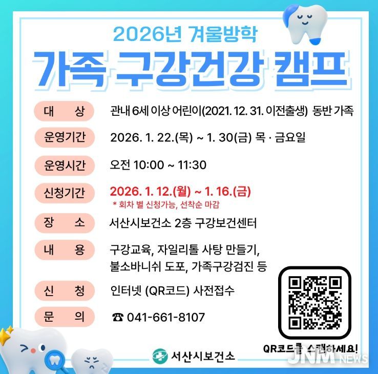 제이앤엠뉴스 | 충남 서산시가 겨울방학 기간을 맞이하여 '가족 구강건강 캠프'를 운영한다. 기간은 1월 22일부터 30일까지 2주간 목요일과 금요일이며, 총 4회에 걸쳐 진행될 예정이다.