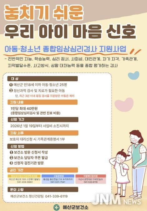 제이앤엠뉴스 | 예산군보건소 정신건강복지센터는 2026년에도 아동·청소년기의 정신 건강 문제를 조기에 발견하고 건강한 성장 발달을 지원하기 위해 아동·청소년 종합임상심리검사비 지원 사업을 추진한다.