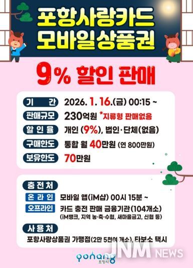제이앤엠뉴스 | 포항시는 오는 16일부터 2026년 카드형·모바일 포항사랑상품권(이하 포항사랑카드)의 첫 할인판매를 시작한다.