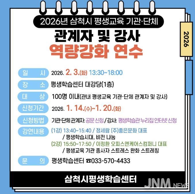 제이앤엠뉴스 | 삼척시는 관내 평생교육 기관·단체 관계자와 강사를 대상으로 촘촘한 교육복지 실현을 위한 ‘2026년 삼척시 평생교육 기관·단체 관계자 및 강사 역량강화 연수’를 개최한다.