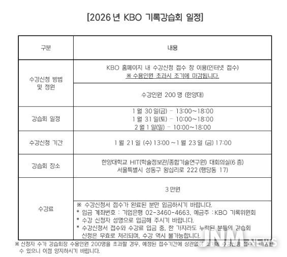 제이앤엠뉴스 | 2026년 KBO 기록강습회가 1월 30일(금)부터 2월 1일(일)까지 서울 한양대학교에서 개최된다. 기록강습회는 야구 공식기록법의 보급과 이해를 통한 저변 확대를 목적으로 프로야구 원년인 1982년부터 개최됐다.