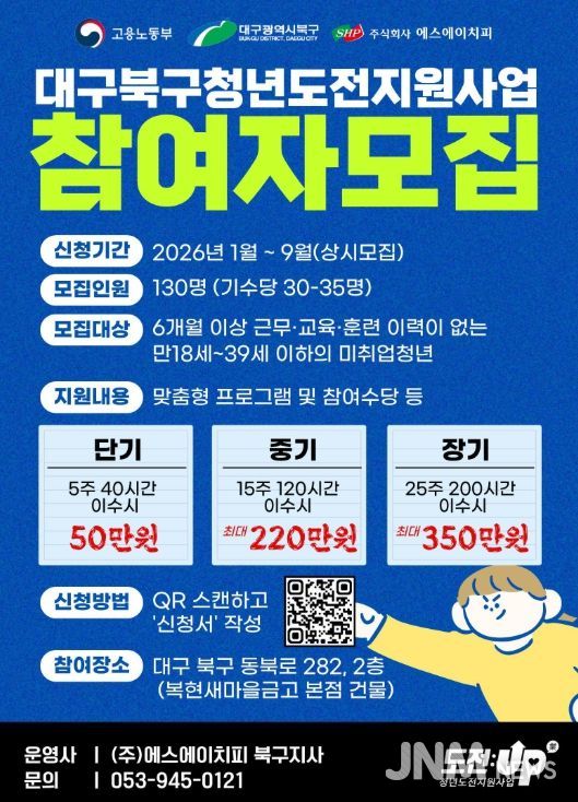 제이앤엠뉴스 | 대구 북구청은 구직 실패와 경제적 부담 등으로 어려움을 겪는 지역 청년들의 사회 진입을 돕기 위해 '2026년 청년도전지원사업' 참여자를 모집한다고 밝혔다.