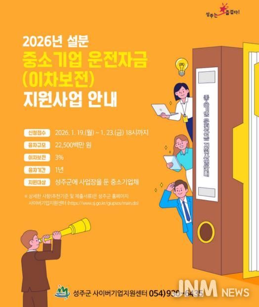 제이앤엠뉴스 | 성주군은 설 명절을 앞두고 관내 중소기업의 자금 부담 완화를 위해 2026년도 중소기업 운전자금(이차보전) 설 명절분을 225억원 규모로 지원한다.